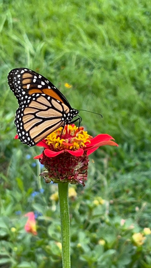 It’s late summer now, and the plants feel like they’re done. It’s been far too hot, far too rainy and the plants are tired. My eastern redbud is dying, its leaves have been dropping all summer and at the base of the tree, you can see the borers doing their damage. The shock of ERJ being sick combined with several other losses this summer broke my heart a little bit. But after some tests, the doctor says my heart is normal. It broke, but it is getting better. I saw a hummingbird a few days ago. I opened the front door and it was hovering above the red Zinnia, staring at me. It looked displeased. I apologized for the lack of selection, but most of the Zinnia had to be pulled because they got powdery mildew. A few days ago, a monarch butterfly arrived to the same plant, and was visibly irritated by the lack of selection. Hopefully they don’t leave me a bad review. I’d like more visitors next year.