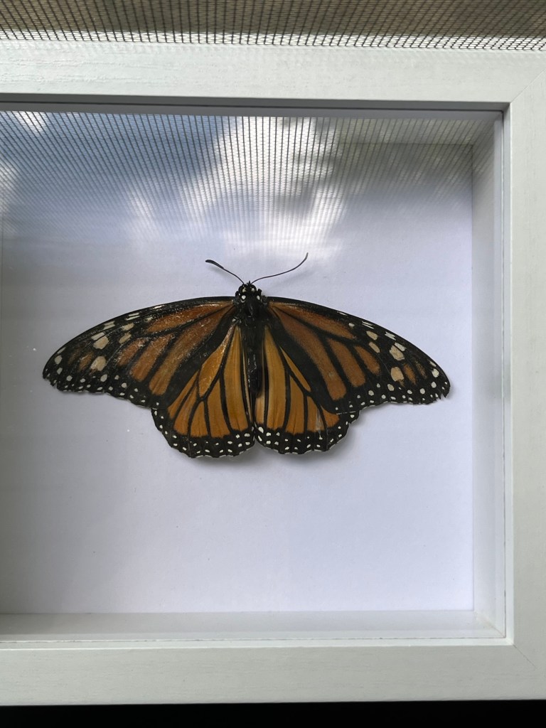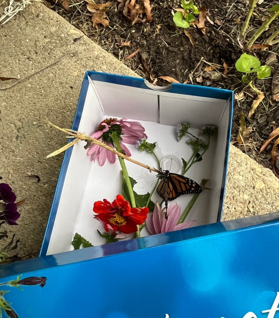 Regina trying to flyHer shoebox full of bloomsRegina I, Danaus plexippus