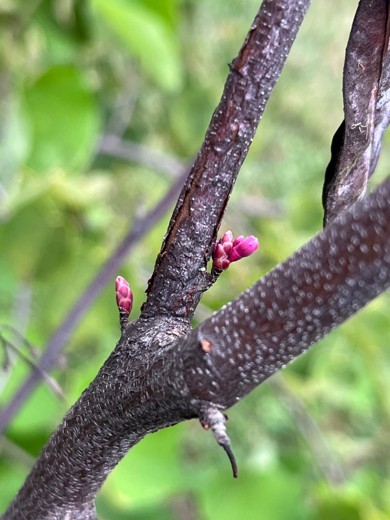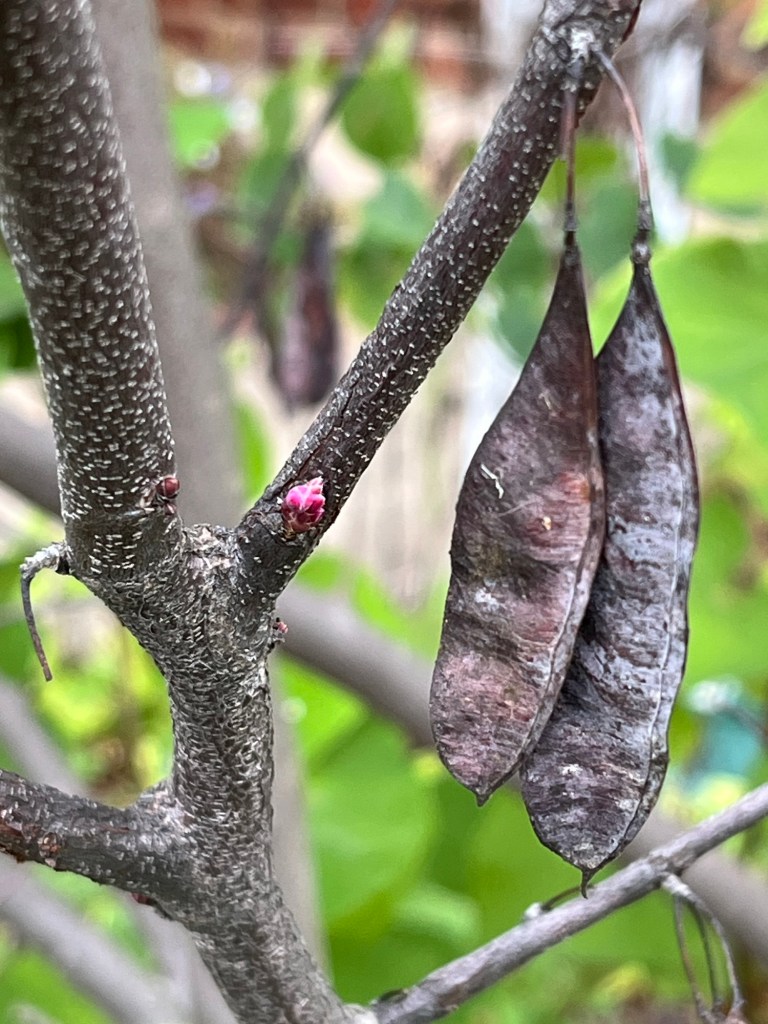 ERJ, my eastern redbud that I’ve written about multiple times on my blog, has been slowly dying all summer and now into the fall. Strangely, he had the most beautiful blooms this year he’s ever had. This past spring, I mean. He’s got borers. They did their damage. I tried everything, but I couldn’t save him. I knew I wouldn’t be able to, but I tried anyway. The loss of this tree really hurts. Some parts of his branches are still pliable, but most are brittle. The bark now splitting from lack of life. But I noticed today a bright spot of pink. And then another. Arising from the broken, cracked bark and perched alongside seedpods as brittle as dead leaves, ERJ blooms one last time.