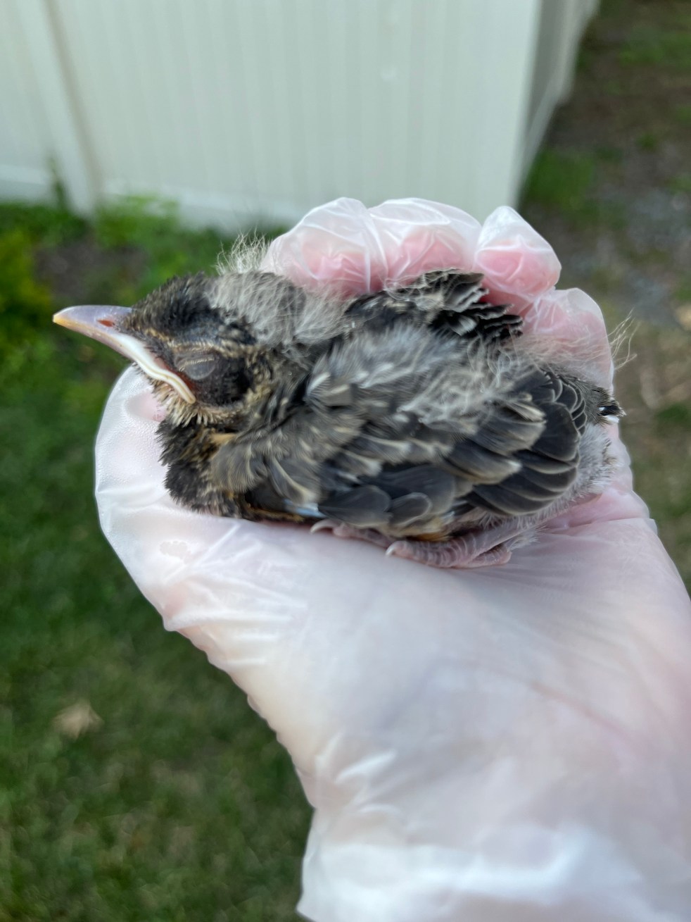 I found out later I didn’t need to wear gloves when touching the baby, that it was not true that a bird will abandon a baby if it smells a human scent on the baby. They will not reject it. In my case, though, I am terribly allergic to birds and would have had to wear gloves anyway. I was experiencing a little bit of a wheeze while holding her, but I wasn’t about to let her go until I knew she would be OK.