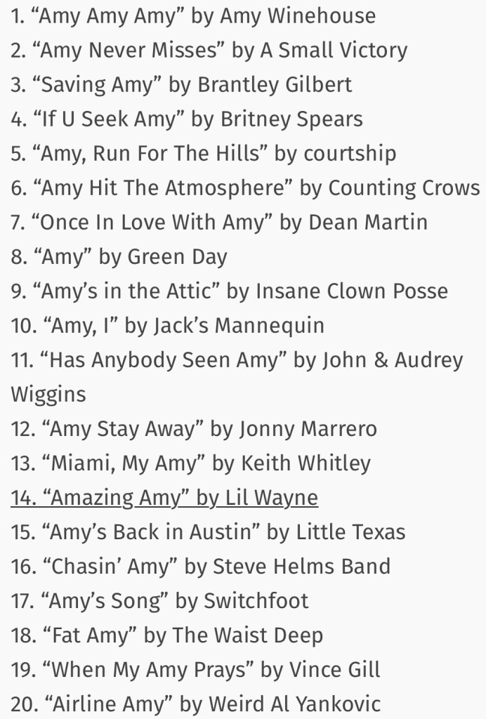 And here is the list of the top 20 songs with the name Amy in them. Admittedly, “Amy, Amy, Amy,” by Amy Winehouse is also my jam, but this song is never heard on the radio, so my interpretive dance, and quality* singing are relegated to the confines of my home. Which is a good thing for society.